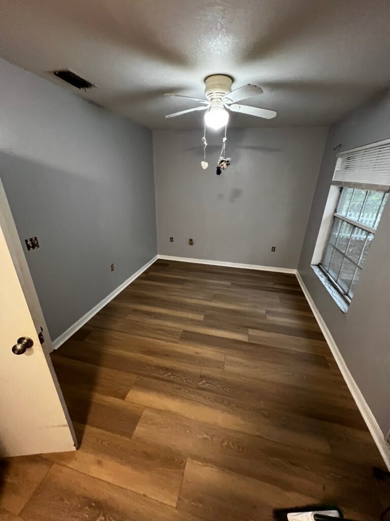 Alt text: Compact bedroom with newly installed light brown gym flooring, gray walls, ceiling fan, and single window for natural light.